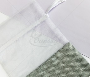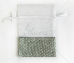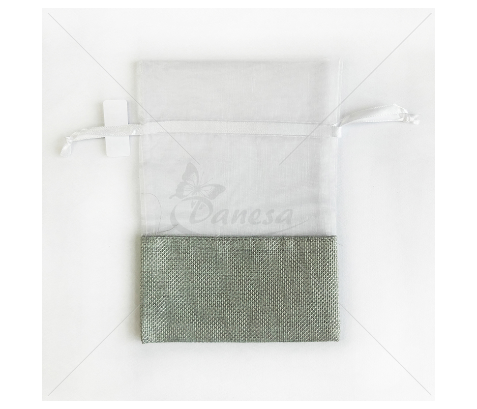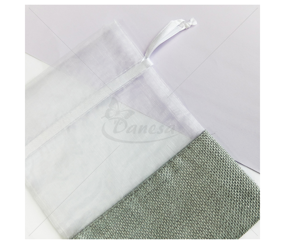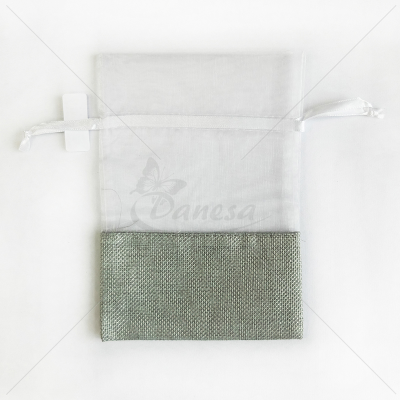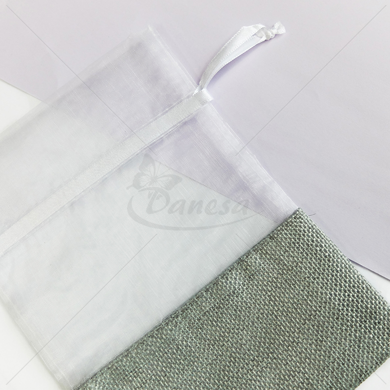 The bottom of the bag is made from a linen-like fabric, the top - from transparent fabric. The drawstrings at the top allow you to easily close the bag and give it a neat, elegant appearance.