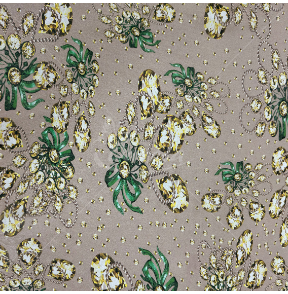 Natūralus šilkas su raštu, kuponinis. Kupono išmatavimai: 1,35 x 1,38 m