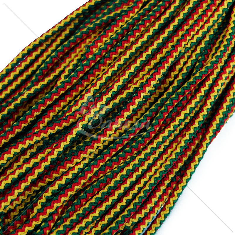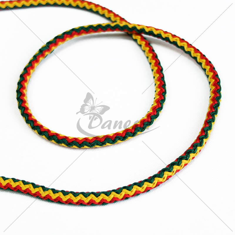 Dekoratyvinė virvė su užpildu, su geltona, žalia ir raudona spalvomis.