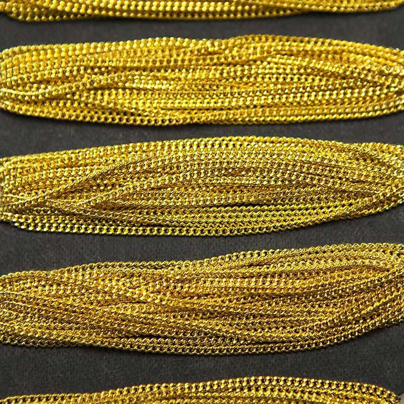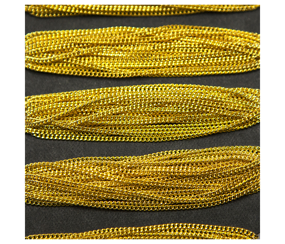 Auksinės spalvos grandinėlės juostelė – dekoratyvinė ir universali juostelė, kurios plotis apie 1.5mm. Puikiai tinka dekoravimui, rankdarbiams, papuošalų gamybai, drabužių, avalynės ar aksesuarų puošybai. Išorinis dizainas suteikia papildomo blizgesio ir išskirtinumo, o lanksti struktūra leidžia lengvai pritaikyti įvairiems kūrybiniams projektams.