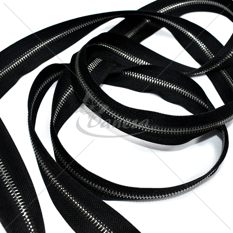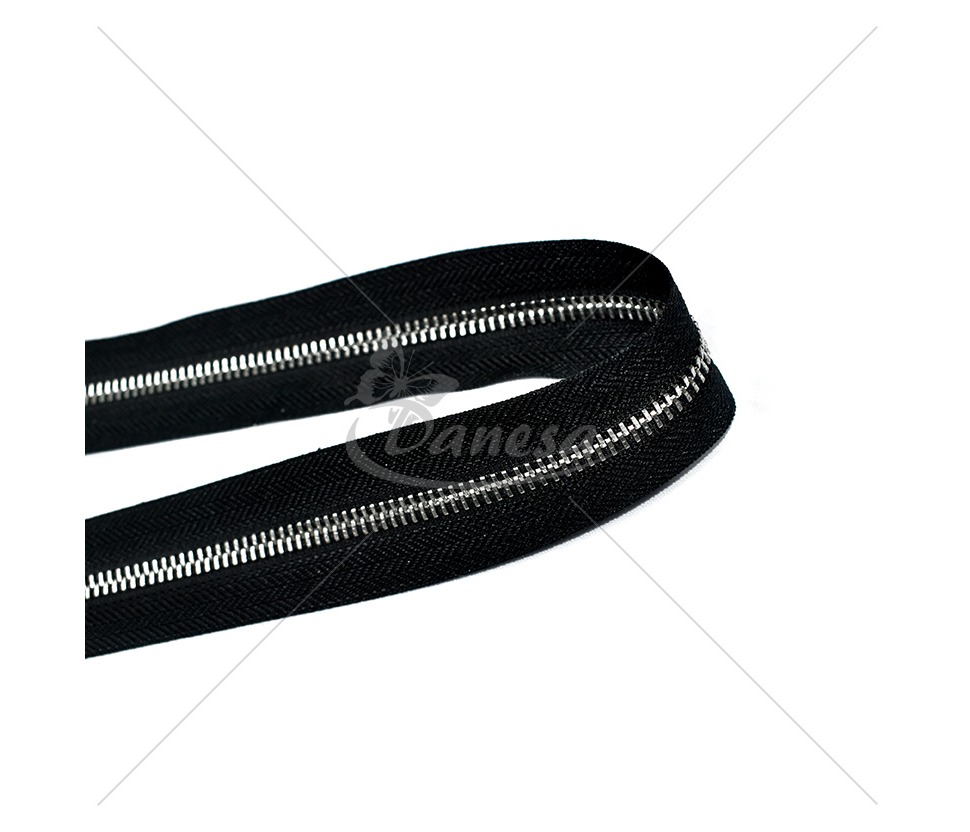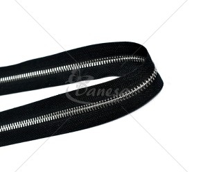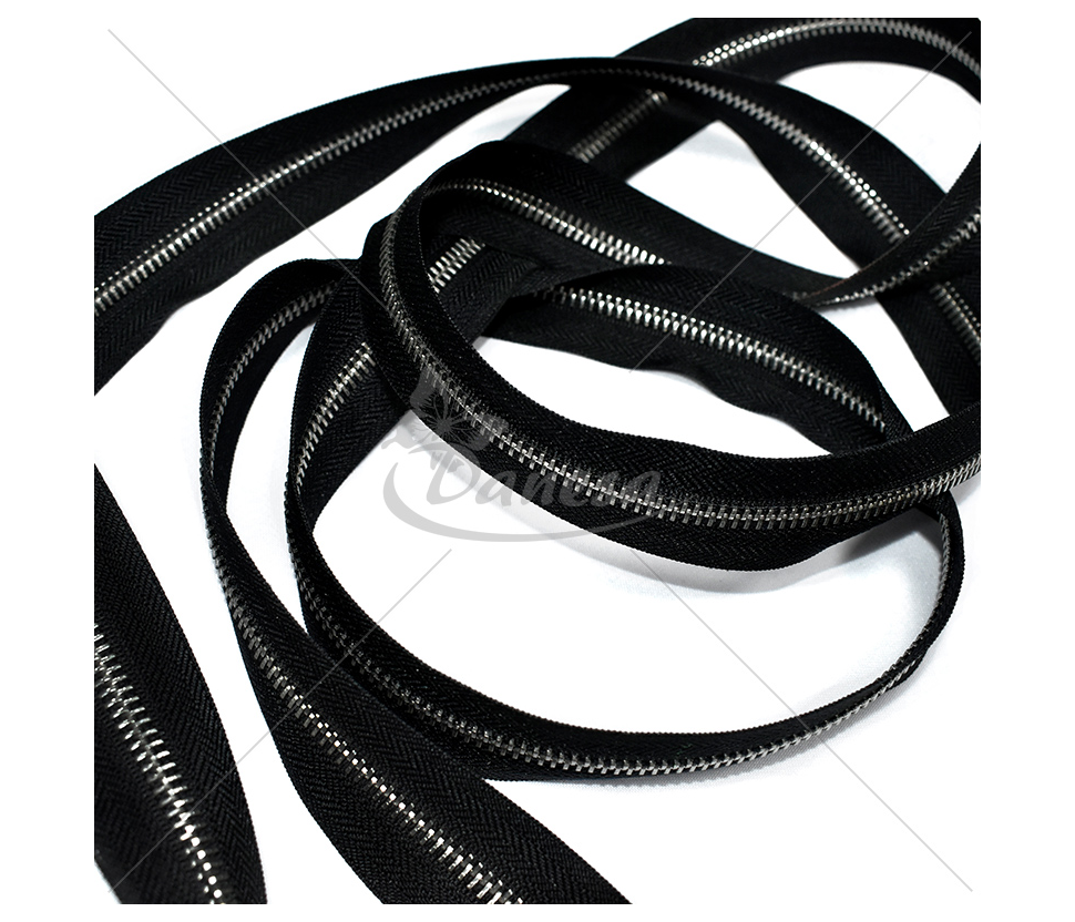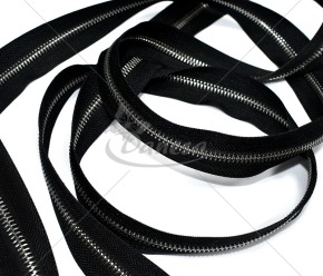Tai metalinis matuojamas užtrauktukas M60, juodos spalvos su sidabriniu takeliu.