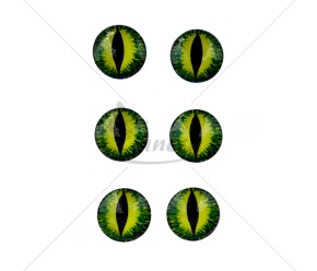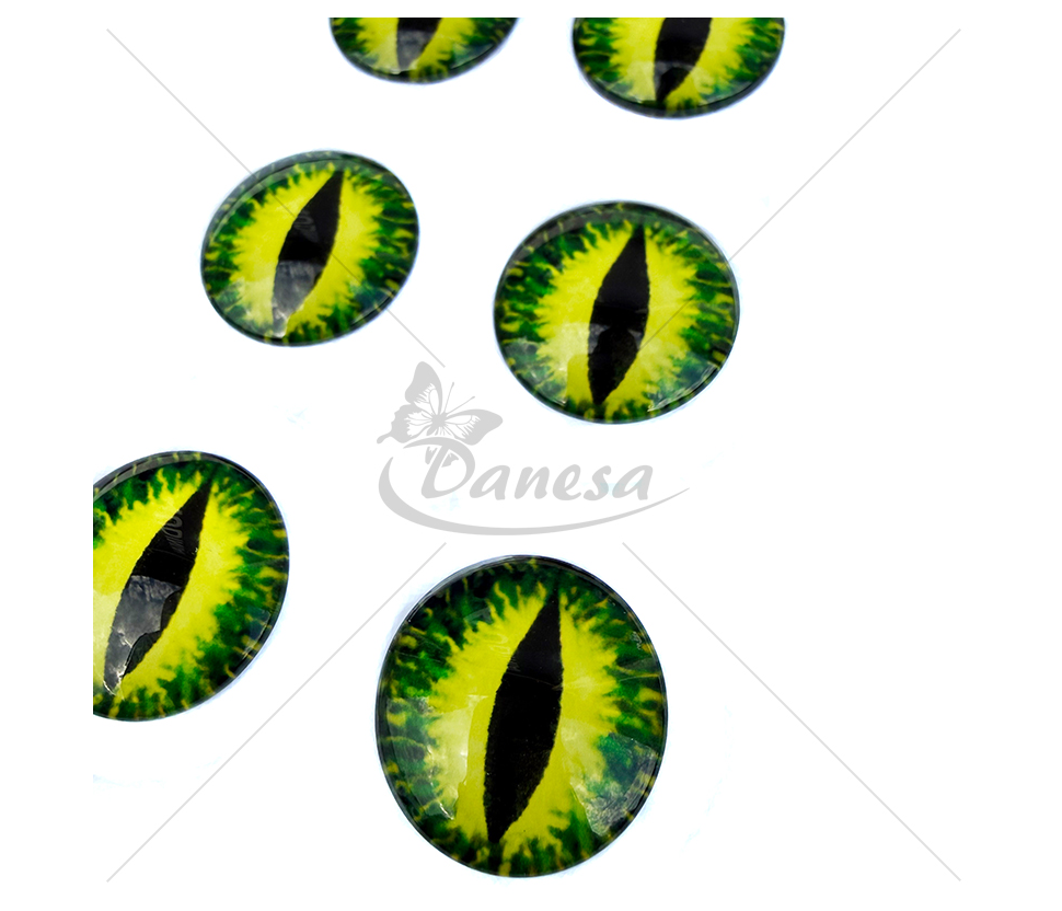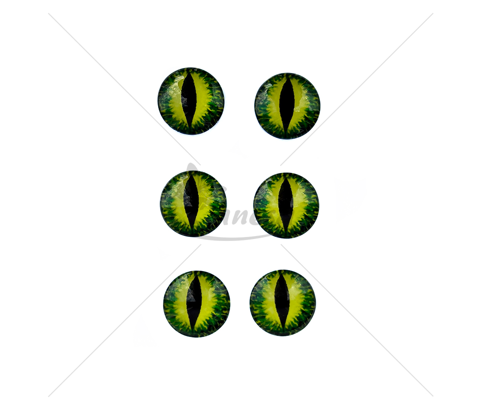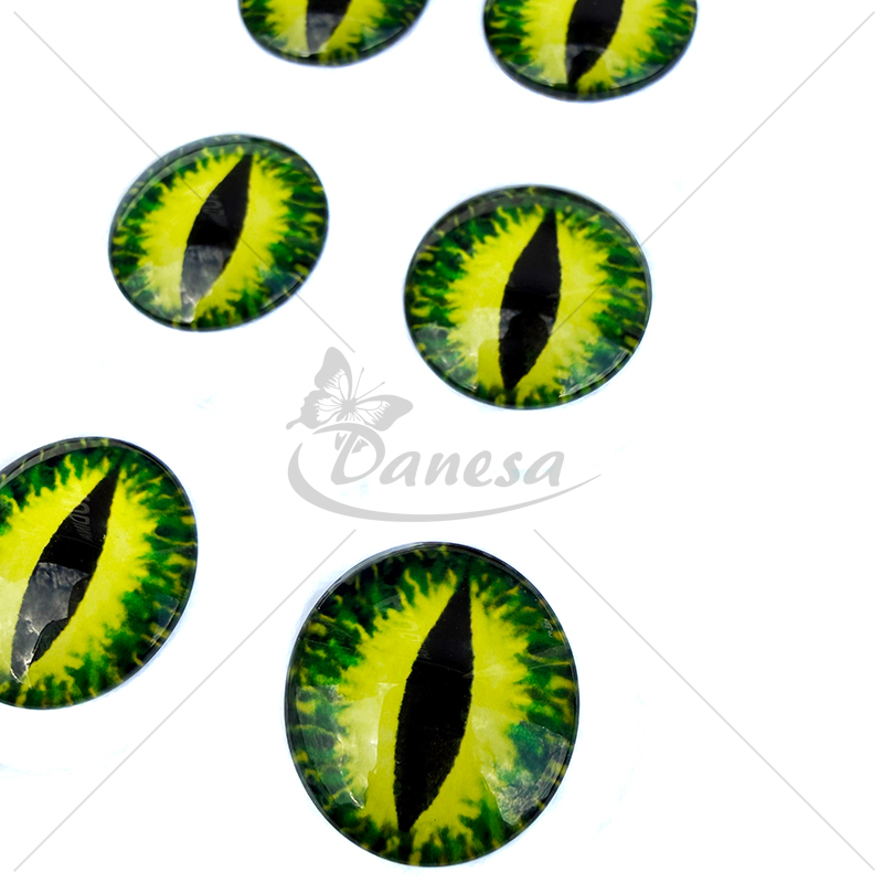 Išskirtinio dizaino klijuojamos dekoratyvinės akys su vertikaliu vyzdžiu, primenančios katės, gyvatės ar fantastinių būtybių akis. Ryškus žalias atspalvis su detaliu raštu suteikia gyvybiškumo ir realistiškumo.