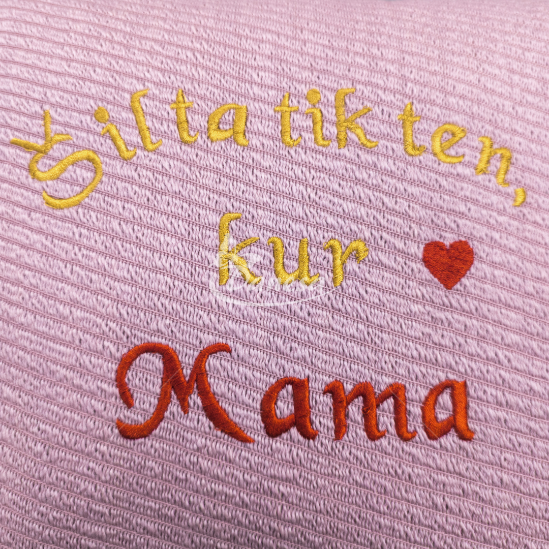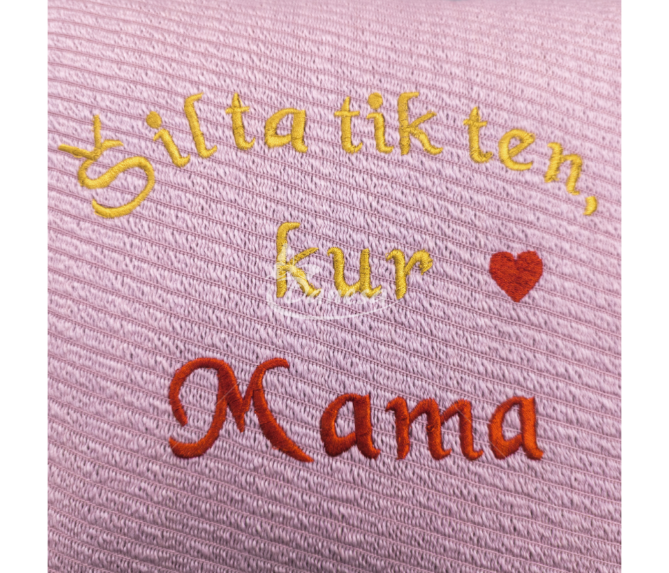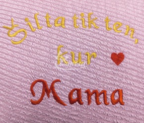 Dizainas: Mašininis siuvinėjimas su užrašu „Šilta tik ten, kur Mama“