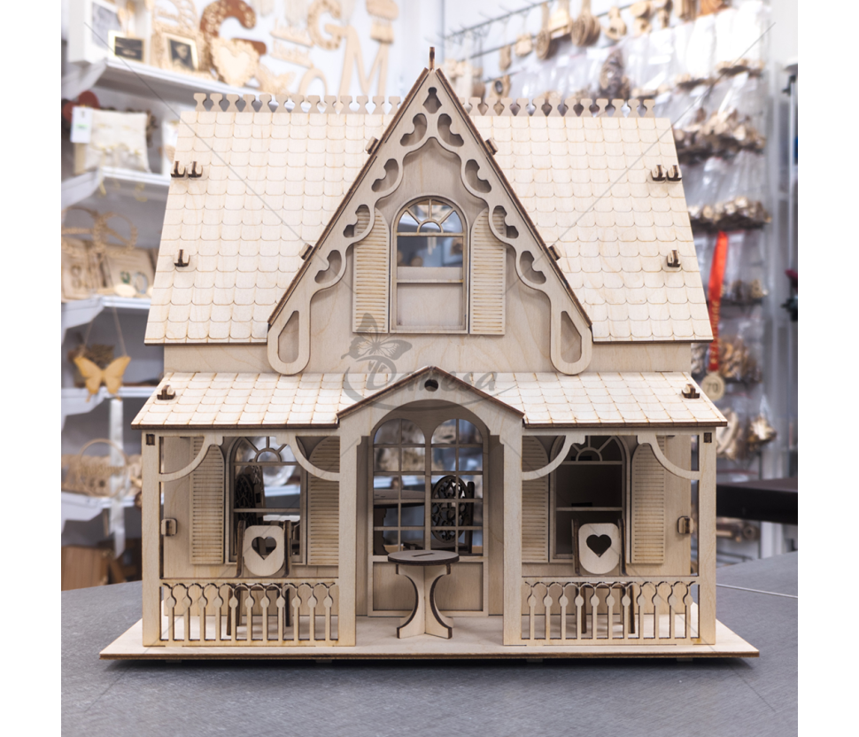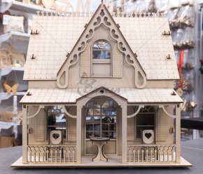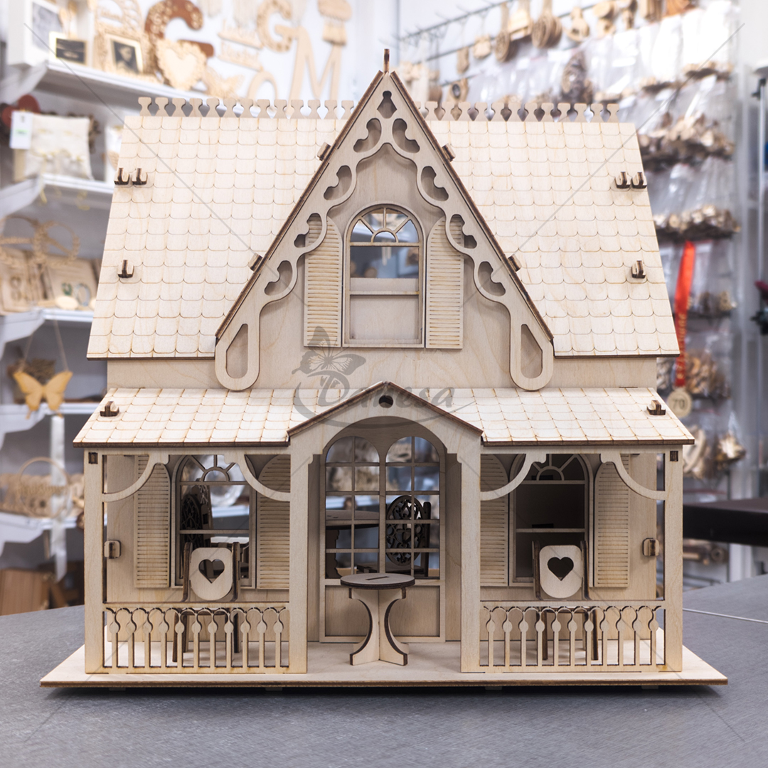 Rankų darbo medinis namas dekoracijai / lelių namelis – dviejų aukštų, detaliai išpuoštas