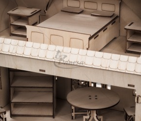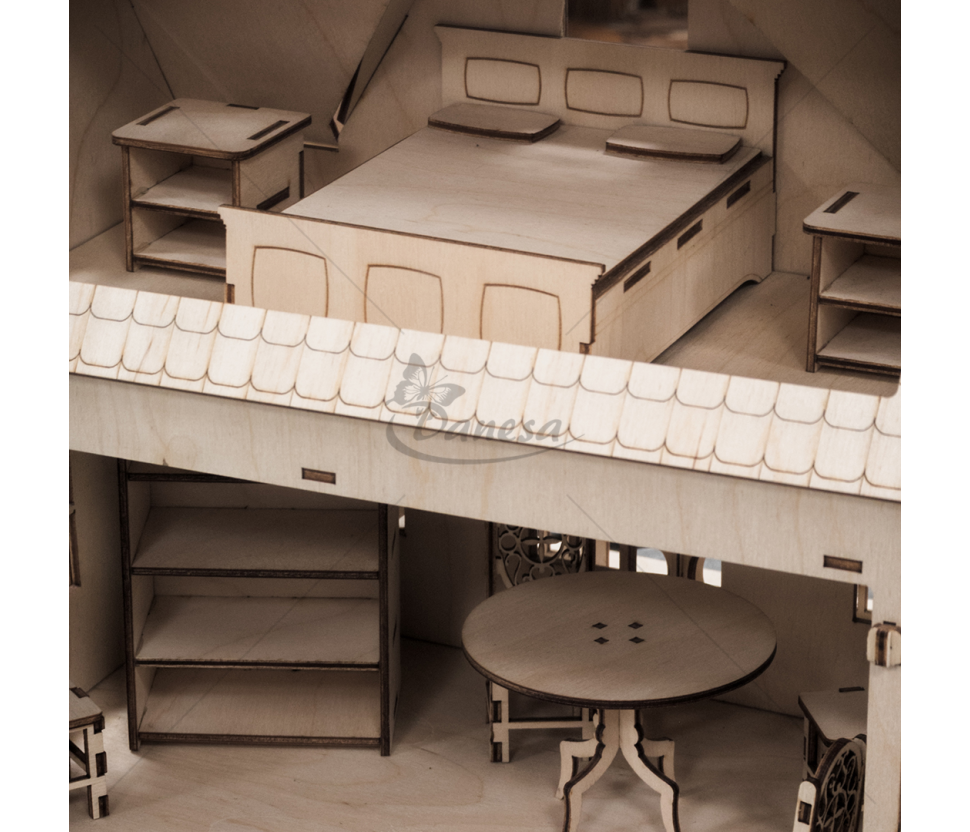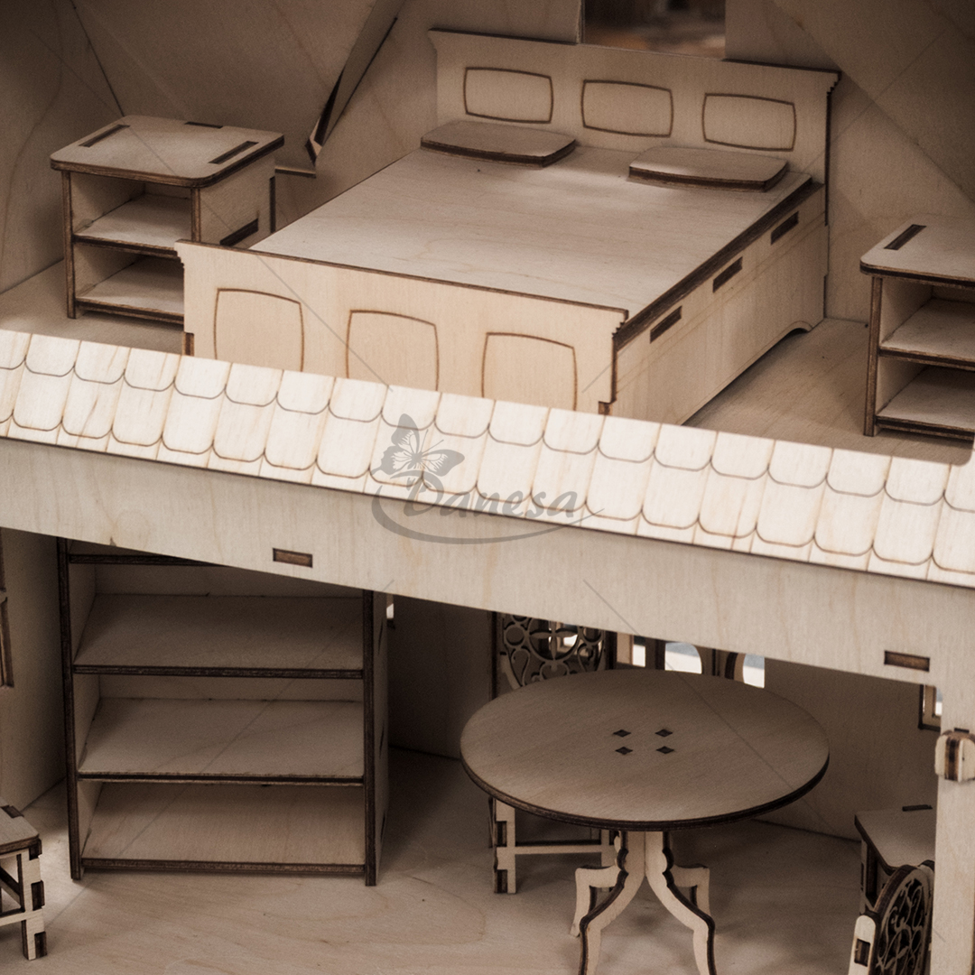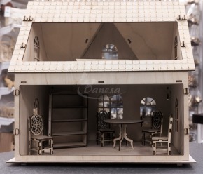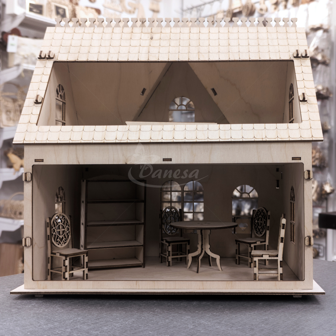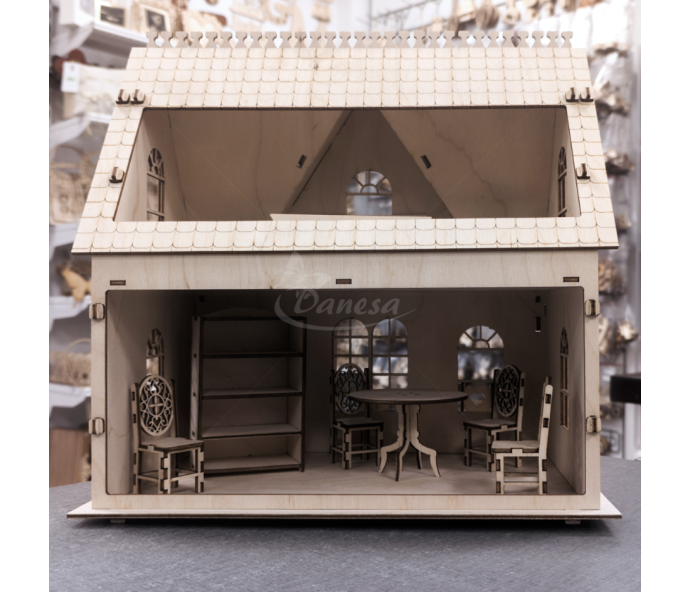 Savybės: stalai, spintos, lovos, sofos, kėdės bei kitos baldų detalės – viskas rankų darbo ir kruopščiai sukurtas. Natūralaus medžio konstrukcija su dažytais akcentais suteikia namui šilumos ir charakterio. Puikus pasirinkimas vaikų žaidimui, lelių kolekcijai arba interjero interaktyviam dekorui.