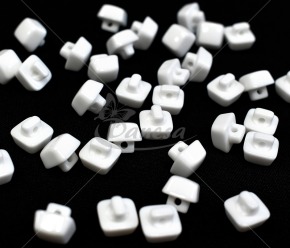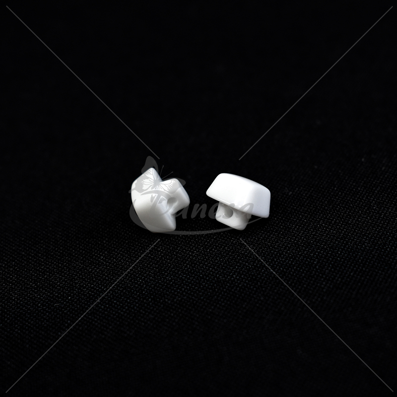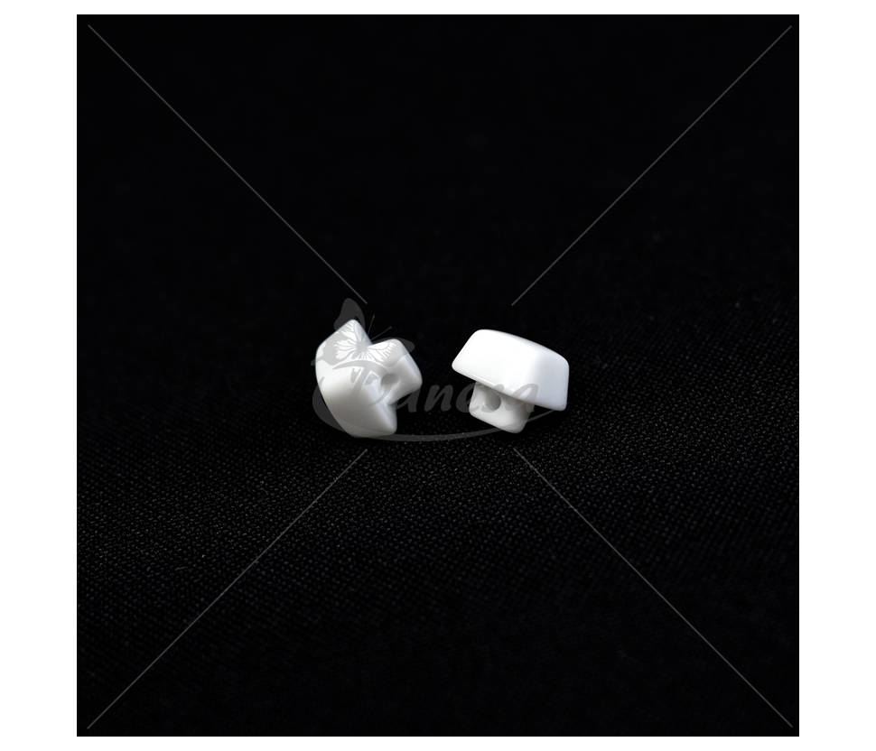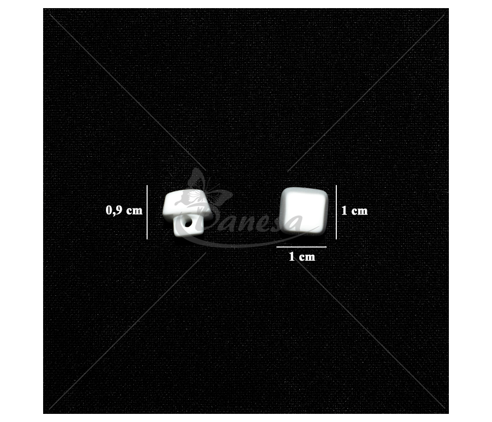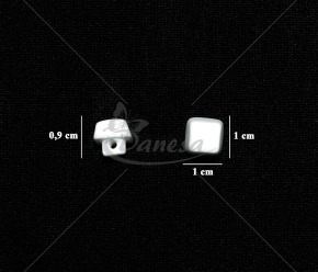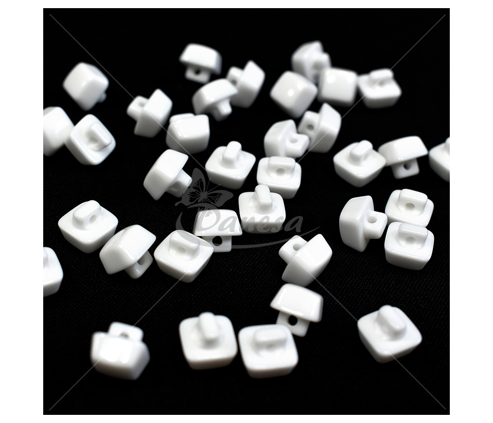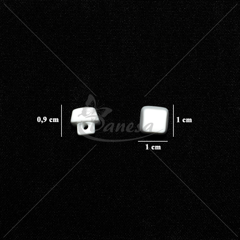 Kvadratinė balta saga, apie 10 mm dydžio, su kojelės tipo tvirtinimu (kojytės ilgis apie 4 mm). Nedidelė, tvarkinga ir universali – puikiai tinka marškiniams, vaikų drabužiams, dekorui ir rankdarbiams.
